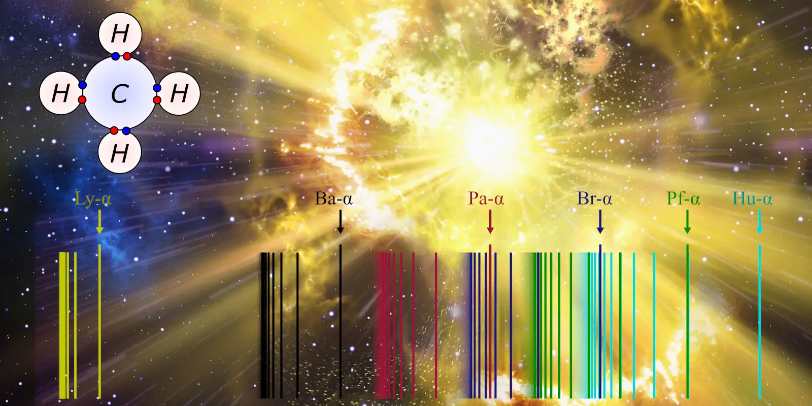 ![Hydrogen (supernova), emission spectrum, and a methane molecule.